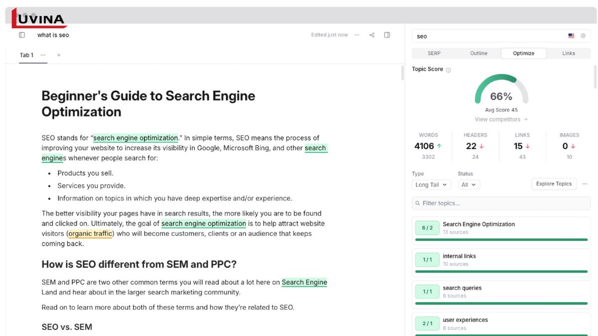 Surfer SEO is an AI-driven tool to improve SEO for e-commerce websites and blogs. By giving data-driven suggestions, Surfer helps one optimize their search engine rankings based on an in-depth analysis of the content that has gone up, the use of keywords, and on-page elements.