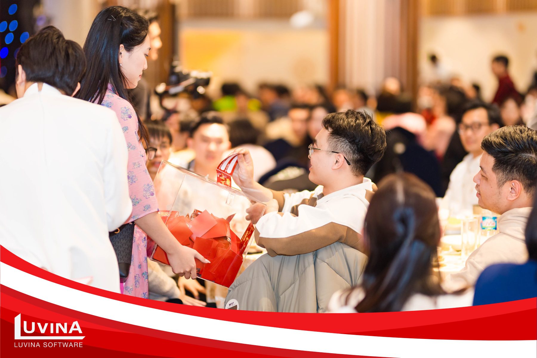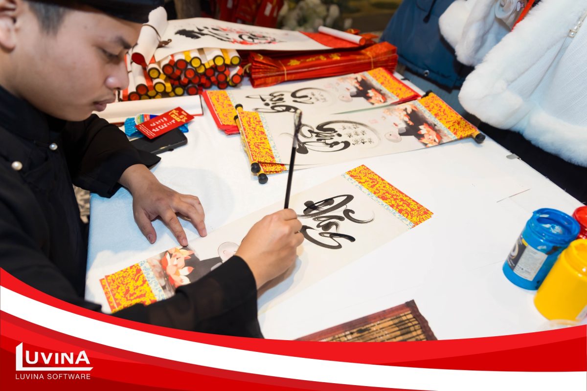 The Hanoi celebration on January 17th was a grand finale to Luvina’s Year-End Party series, combining elegance with cultural richness. Similar to Da Nang, the event began with check-in and red envelopes to bring good luck and smiles to everyone’s faces. The presence of a skilled calligrapher added a nostalgic touch, as guests eagerly received personalized scrolls adorned with meaningful words.