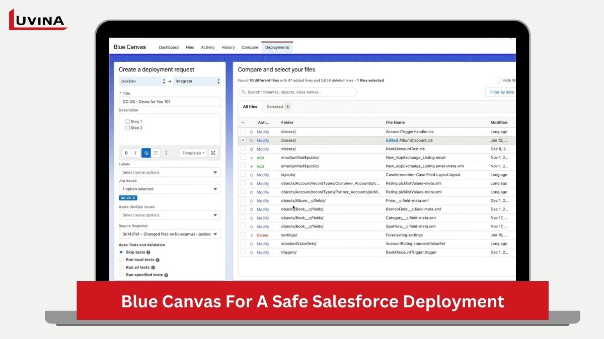 For a safe and swift Salesforce deployment, you need the assistance of Blue Canvas. With this tool, you can deploy to sandboxes, and organize staging, and production with push-button deployment technology. Blue Canvas also empowers administrators and developers with full version control over Salesforce, ensuring safer deployment processes and higher code quality.