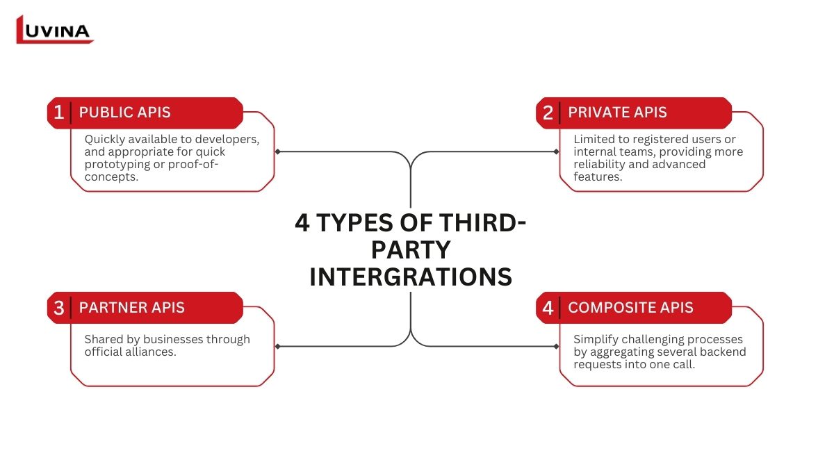- – Partner APIs: Shared by businesses through official alliances, partner APIs help with white-label integrations, cobranded goods, and revenue-sharing models.