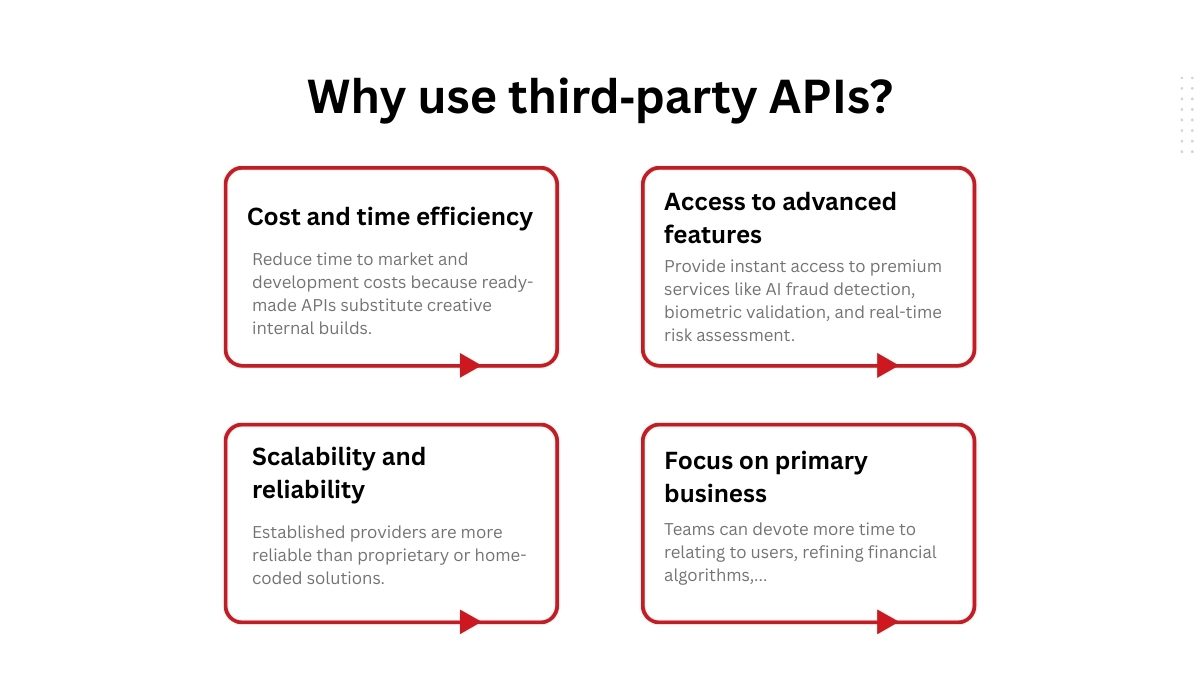 A third-party API in fintech is essentially a readymade link allowing your system to access specialized financial services without having to create them from scratch. These APIs let software easily incorporate fraud detection tools, payment gateways, banking data, or communication channels by acting like virtual bridges. Businesses could use APIs from reputable providers to speed product development and provide dependable financial experiences rather than trying to reinvent the wheel. Fintechs leveraging outsourced API integration typically reduce development cost by 30-50% while accelerating compliance readiness by several months.