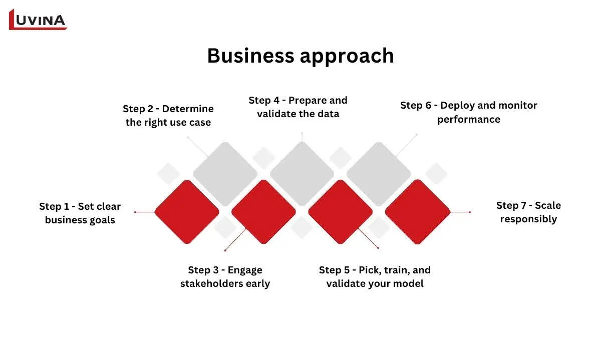 - Step 1 – Set clear business goals: Determine precise areas where artificial intelligence might generate quantifiable benefit, including automating customer care, improving product design, or speeding content output, and set clear company goals. Match every project to general corporate goals and set precise KPIs to monitor outcomes.