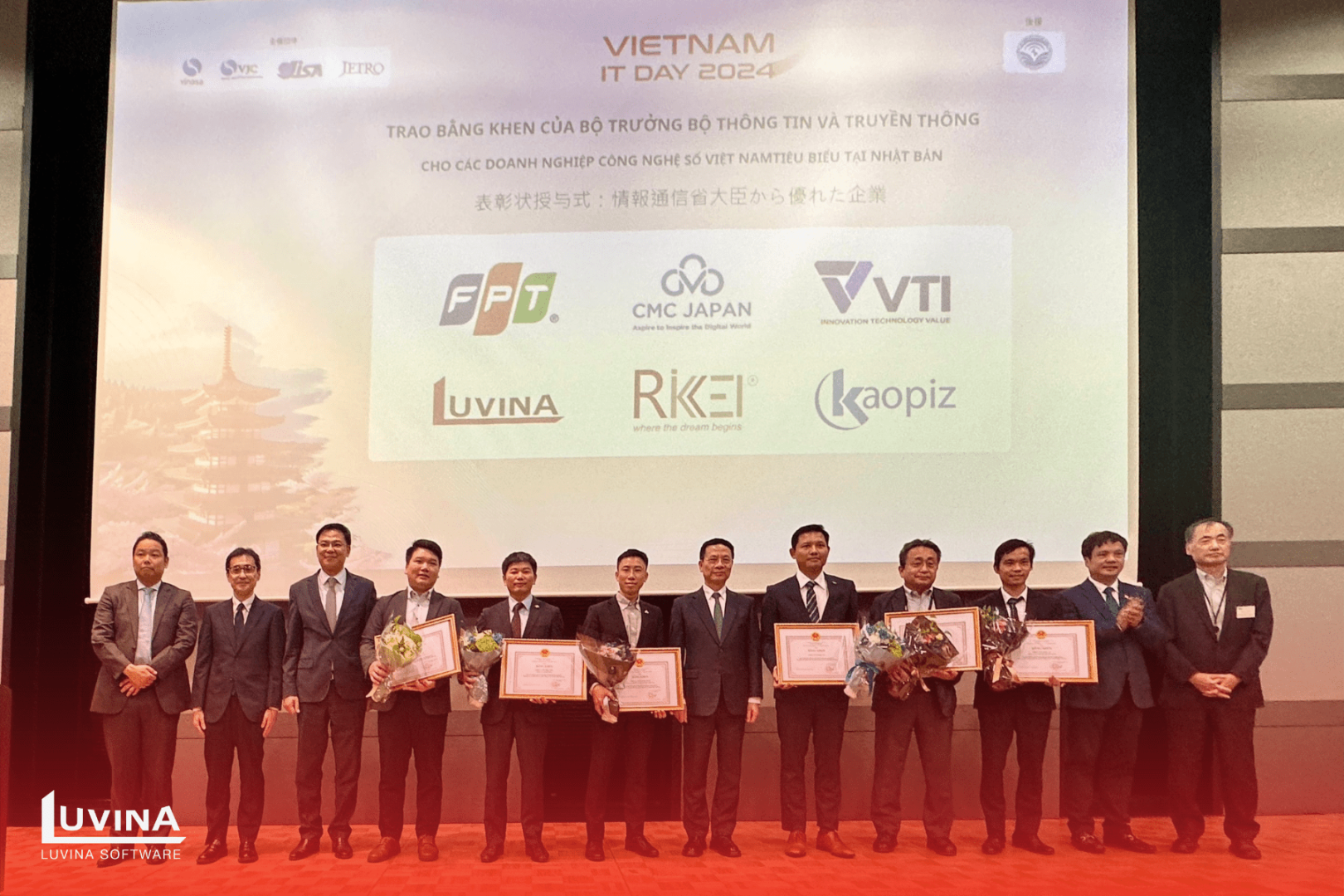 Trong khuôn khổ sự kiện Vietnam IT Day 2024, Luvina Japan vinh dự được Bộ trưởng Bộ Thông tin và Truyền thông trao tặng Bằng khen, ghi nhận là một trong những công ty CNTT tiêu biểu của Việt Nam. Giải thưởng này không chỉ đánh dấu những đóng góp xuất sắc của Luvina trong việc mở rộng thị trường quốc tế, mà còn khẳng định vai trò quan trọng của công ty trong sự phát triển của ngành công nghệ thông tin Việt Nam, đặc biệt trong bối cảnh nền kinh tế toàn cầu đang thay đổi nhanh chóng.