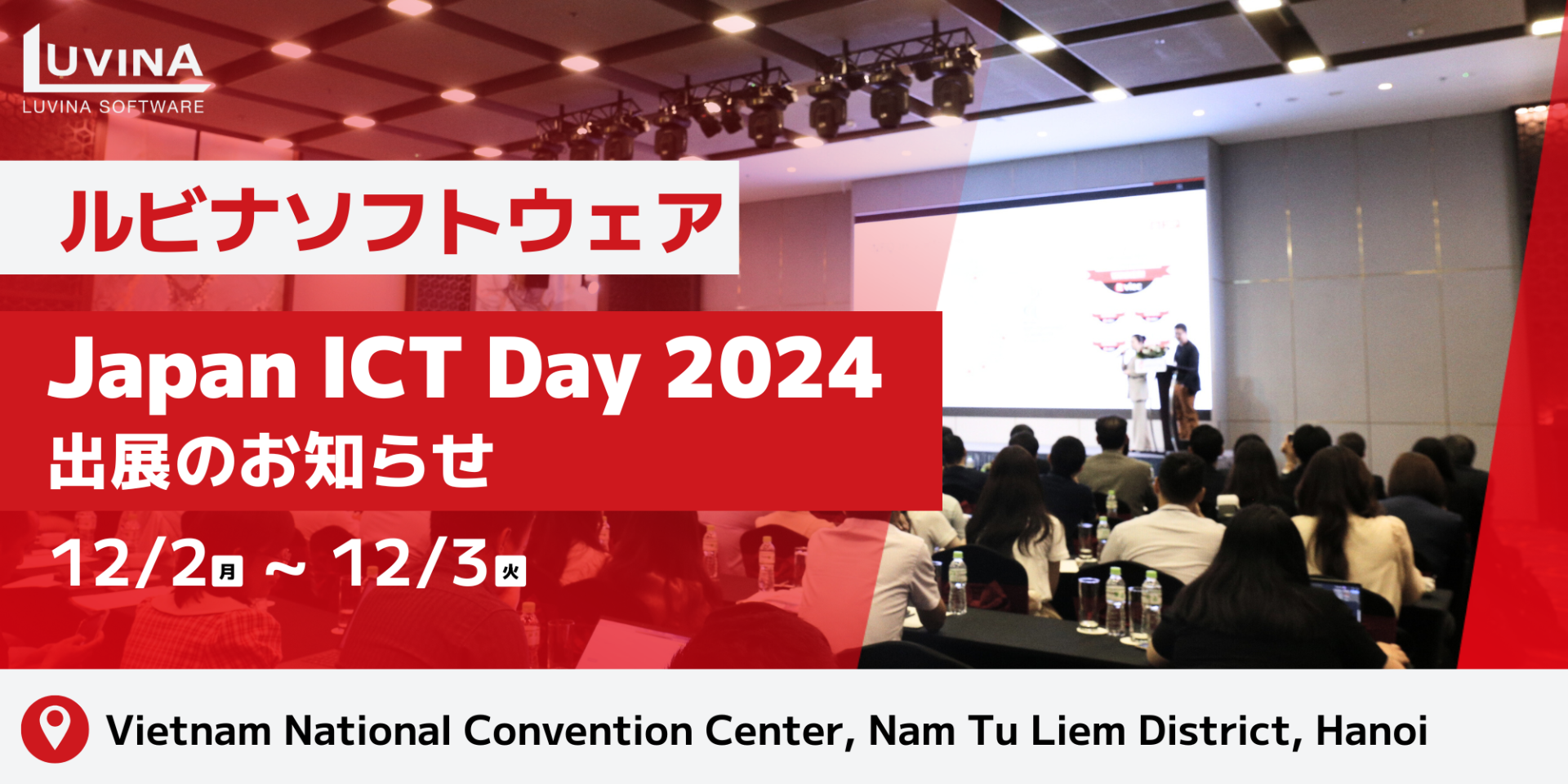 Từ ngày 2 đến 3 tháng 12 năm 2024, Luvina Software sẽ tham gia sự kiện JAPAN ICT DAY 2024 tại Hà Nội. Đây là sự kiện thường niên do VINASA, VJC và JISA tổ chức, nhằm thúc đẩy sự hợp tác giữa Việt Nam và Nhật Bản trong lĩnh vực công nghệ thông tin (CNTT).
