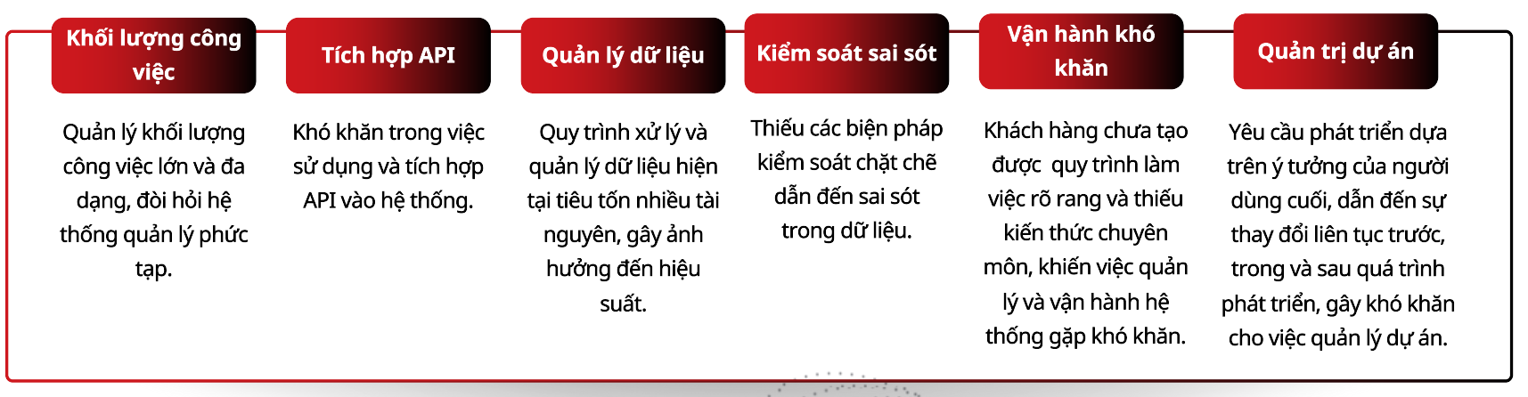 Khách hàng phải đối mặt với những thách thức bao gồm quản lý khối lượng công việc phức tạp, khó khăn trong tích hợp API, xử lý dữ liệu tốn nhiều tài nguyên, thiếu kiểm soát lỗi nghiêm ngặt, hoạt động kém hiệu quả do thiếu chuyên môn và phạm vi dự án liên tục thay đổi do ý kiến từ người dùng cuối.